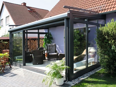 The luxury sliding terrace enclosure CORSO Premium by Alukov combines an aluminum structure, polycarbonate roof and CONNEX 33.1 safety glass. The elegant design and panoramic view provide year-round comfort and smooth handling.