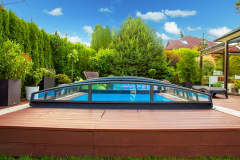 The VIVA™ pool enclosure by Alukov is a low-profile solution with a single-track system, allowing barrier-free access from three sides. This modern design protects the pool from dirt, speeds up water heating and maintains temperature overnight.