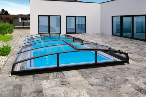The AZURE Flat pool enclosure is a low-profile solution with an elegant design that harmoniously fits into modern gardens thanks to its multi-radius concept. It features a single-wall polycarbonate fill and a frame in silver or anthracite color.