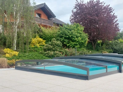 The PARADE pool enclosure offers the ideal combination of functionality and aesthetics for protecting your garden pool. With its modern design and technical solutions, it becomes a tasteful and unobtrusive addition to any garden. The telescopic structure is stable yet lightweight, allowing for very easy movement of all its parts. The unique track system, placed only on one side, ensures an elegant appearance and facilitates access to the pool from other sides.