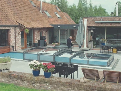Transparent polycarbonate panels provide a clear view of the pool even when closed, enhancing the visual connection with the water surface and contributing to the overall aesthetic impression. The safety lock prevents the enclosure from accidentally opening or being blown open by sudden strong winds when you're not around, ensuring protection not only for the pool but also for its surroundings.