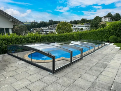 Low pool enclosures are an ideal solution for anyone seeking to combine aesthetics, functionality, and comfort. Thanks to their discreet profile, the enclosure blends seamlessly into the overall appearance of the garden or outdoor area while providing full protection for the pool against debris, harsh weather, and heat loss.