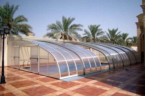 The STYLE™ pool enclosure is designed to cover pools near a house wall or a standalone wall. Thanks to the arched aluminum profile shape, it blends seamlessly with the structure and creates a compact aesthetic solution.