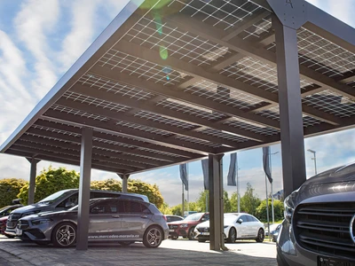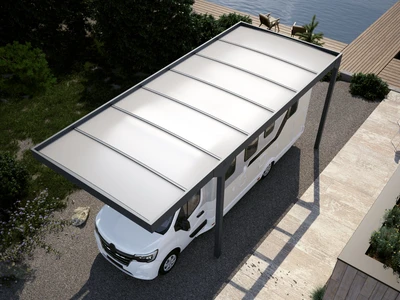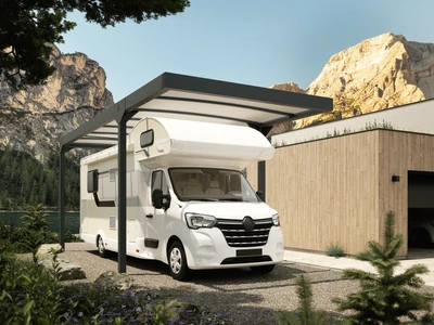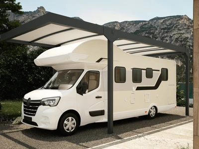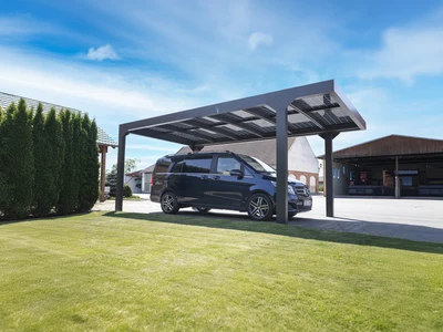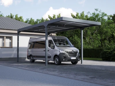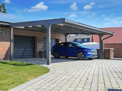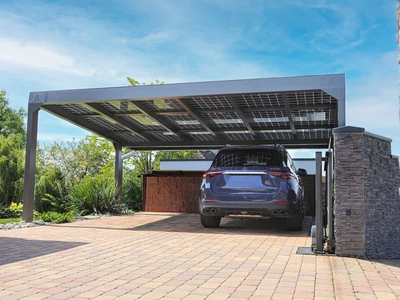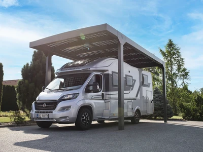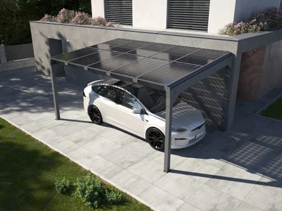 The Carport Solar Premium is a top-tier solar shelter for your vehicle, equipped with frameless glass-glass photovoltaic panels. It features elegant design, integrated gutters and rainwater drainage. The Single variant with 9 panels delivers 3.91 kWp, while the Double variant with 15 panels reaches 6.52 kWp – enough to efficiently charge electric vehicles and cut energy costs.
